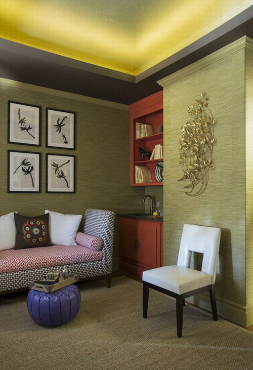 Pokój projektu Gorelick, choć obfituje w różnorodne wzory i kolory nie daje wrażenia przepychu, czy chaosu. Okno udekorowane zasłoną, na której nadrukowane są duże, soczyście zielone liście filodendrony tworzy ciekawe zestawienie z szezlongiem. Zdobi go sprowadzona z Indii tkanina w dwóch, różnokolorowych wzorach, nawiązujących do czerwonych mebli i ciemnobrązowych akcentów. Wisienką na torcie jest pufa, w niezwykle modnym w tym sezonie, kolorze kobaltu, który może posłużyć również jako stolik kawowy. Całość dopełniają inspirowane Azją drobiazgi stojące na biurku i pułkach po obu stronach okna.