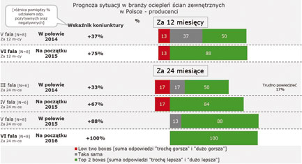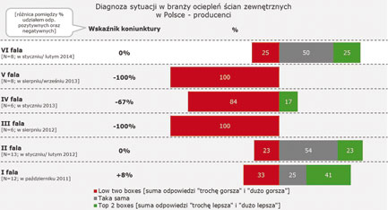 W porównaniu z poprzednimi falami badania obecnie następuje odwrócenie nastrojów w branży ociepleń. Wskaźnik dzisiejszej koniunktury dla budownictwa, czyli różnica między udziałem pozytywnych a negatywnych ocen, jest dziś najlepszy od początku pomiaru i wynosi +38 proc. (w poprzednich falach m.in. –83 proc. oraz dwukrotnie –100 proc.). Dla sektora ociepleń wartość wskaźnika koniunktury wynosi 0 proc., podczas gdy w trzech wcześniejszych pomiarach wskazania były ujemne (w tym dwukrotnie –100 proc i raz –67 proc.). Oznacza to, że w opinii producentów systemów ETICS aktualne położenie budownictwa i ich własnej branży jest lepsze niż rok i dwa lata temu.