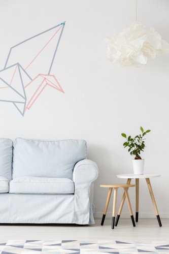 Kolejnym sposobem na ożywienie wnętrza na wiosnę jest zastosowanie wzorów - zarówno na ścianach, jak i na elementach dekoracyjnych: poduszkach, narzutach i zasłonach. Mocne, geometryczne linie dodają energii, a motywy roślinne, np. modna w ostatnim czasie monstera, bezpośrednio nawiązują do budzącej się do życia natury. Proste motywy, takie jak chevron czy pionowe pasy, można wykonać samemu używając taśmy malarskiej lub specjalnego szablonu. Ciekawy efekt na białej ścianie uzyskamy wykonując taki wzór w kolorze zieleni Amazonii lub tutti-frutti.