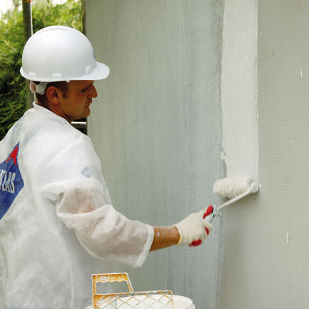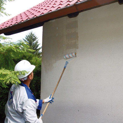 - Po wyschnięciu elewacji, w celu zmniejszenia chłonności, ściany gruntuje się emulsją Atlas Uni-Grunt. Nanosi się ją wałkiem (można także pędzlem) w postaci nierozcieńczonej.