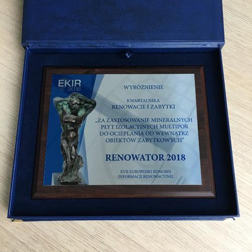 Multipor, innowacyjny system do ociepleń od wewnątrz obiektów historycznych, otrzymał prestiżowe wyróżnienie Renowator 2018. Nagroda została wręczona podczas XVII Europejskiego Kongresu Informacji Renowacyjnej w Krakowie, największej konferencji dla konserwatorów zabytków w Polsce.