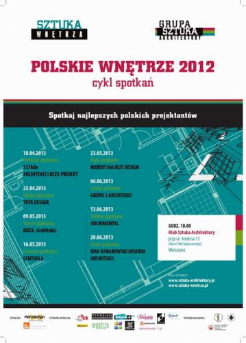 18 kwietnia 2013 r. w warszawskim Klubie Sztuka Architektury rozpocznie się kolejny, drugi już cykl spotkań z polskimi projektantami wnętrz, którzy opowiedzą o swoich najciekawszych aranżacjach ubiegłego roku nominowanych w plebiscycie Polskie Wnętrze 2012, organizowanym przez wortal sztuka-wnetrza.pl