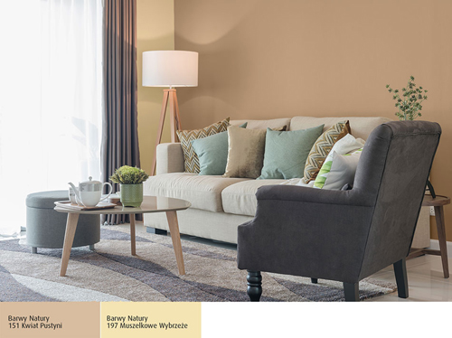 Pomysł z kilkoma kolorami wydaje Ci się zbyt szalony, ponieważ wolisz sprawdzone, bezpieczne rozwiązania? Zdecyduj się na ciepłe, uniwersalne beże. Połączenie kilku ich odcieni nie zaburzy przestrzeni, natomiast uczyni ją interesującą i przytulną. W naszym salonie klimat tworzą farby Śnieżka Barwy Natury w kolorach 151 Kwiat Pustyni i 197 Muszelkowe Wybrzeże.
