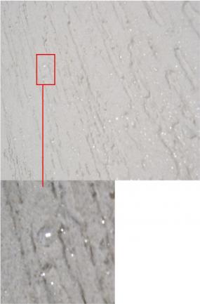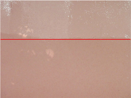 Rys. 3. Farba elewacyjna niezawierająca naturalnych proszków mineralnych (czerwona lina wskazuje granice między pierwszą a drugą warstwą).