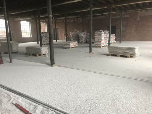 Przy odbudowie stropów fabryki Edwarda Ramischa wykorzystano technologię fermecell. W skład systemu podłogowego wchodzi podkład uszczelniający, granulowana podsypka wyrównująca oraz elementy jastrychowe o grubości 25 mm łączone klejem poliuretanowym i wkrętami fermacell. Przy montażu sufitów skorzystano natomiast z płyt cementowo-włóknowych o grubości 12,5 mm, które ułożono dwuwarstwowo (2x12,5 mm). Do ich łączenia wykorzystano klej poliuretanowy oraz wkręty samogwintujące. Wcześniej jednak na sufitach ułożono odpowiednią warstwę wełny mineralnej.