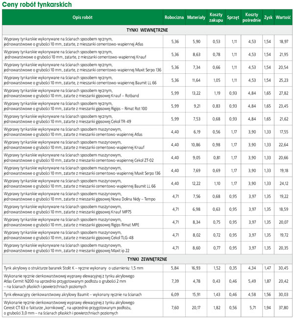 Poniżej zamieszczamy tabelę z cenami tynków oraz ceny robót tynkarskich. Pierwsza zawiera średnie ceny tynków zewnętrznych oraz wewnętrznych najważniejszych producentów. Druga tabela została opracowana na podstawie średnich stawek robocizny oraz narzutów.